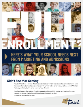 Whether your school is operating from a position of strength or teetering on the tipping point, Tassel can help. Our proven process will challenge your thinking, clarify the win, and position your school to connect with right-fit families. And we’ll start by focusing on a simple but critical question: “What does your school need from marketing in this season?”